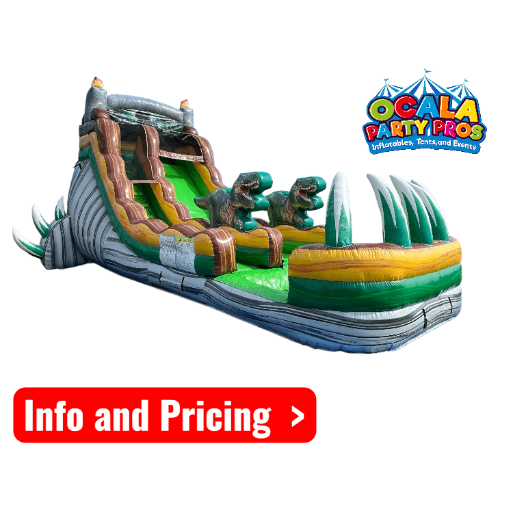 Introducing "T-Rex Falls" 🦖 - a towering prehistoric adventure ready to make a splash at your next event in Ocala, Florida! Standing an impressive 18 feet tall, this larger-than-life water slide brings the excitement of the Mesozoic era right to your backyard.🌴🦕🌊